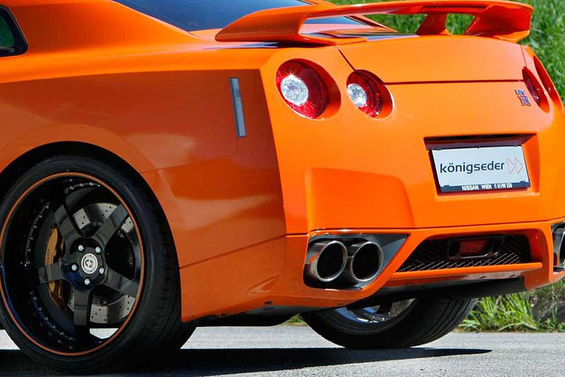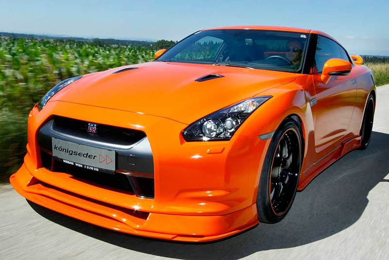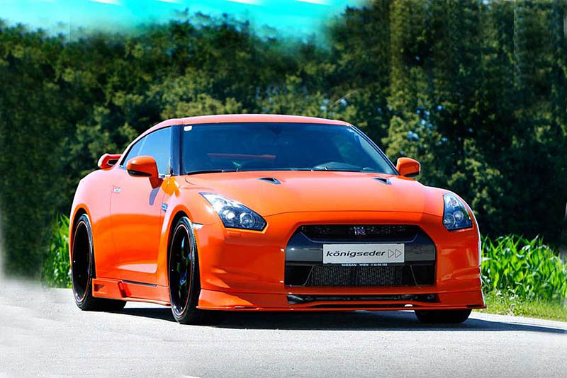 Австрийские мастера фирмы Königseder на примере Nissan GT-R показали, как можно сделать небольшой, но настоящий спортивный тюнинг. Для творческой работы потребовалось: полноприводное спортивное японское купе с двигателем мощностью 485 л.с., способное ехать со скоростью более 300 км/ч, чип от Importracing на 95 лошадок для блока управления мотором, комплект спортивных пружин от KW, выхлопная система Akrapovic из титана, воздушный фильтр K&N и легкосплавные диски от HRE диаметром 21 дюйм. Затем последовала лакировка в оранжевый цвет (альтернативный вариант – оклейка) и вот – из «скромного» Nissan GT-R получился острый меч самурая, способный, по словам австрияков, разогнаться до 200 км/ч за 9,8 секунды. Информацию о том, за какое время спорткар разгоняется до отметки 100 км/ч, и какова его максимальная скорость, инженеры из Кремсмюнстера держат, к сожалению, в секрете.