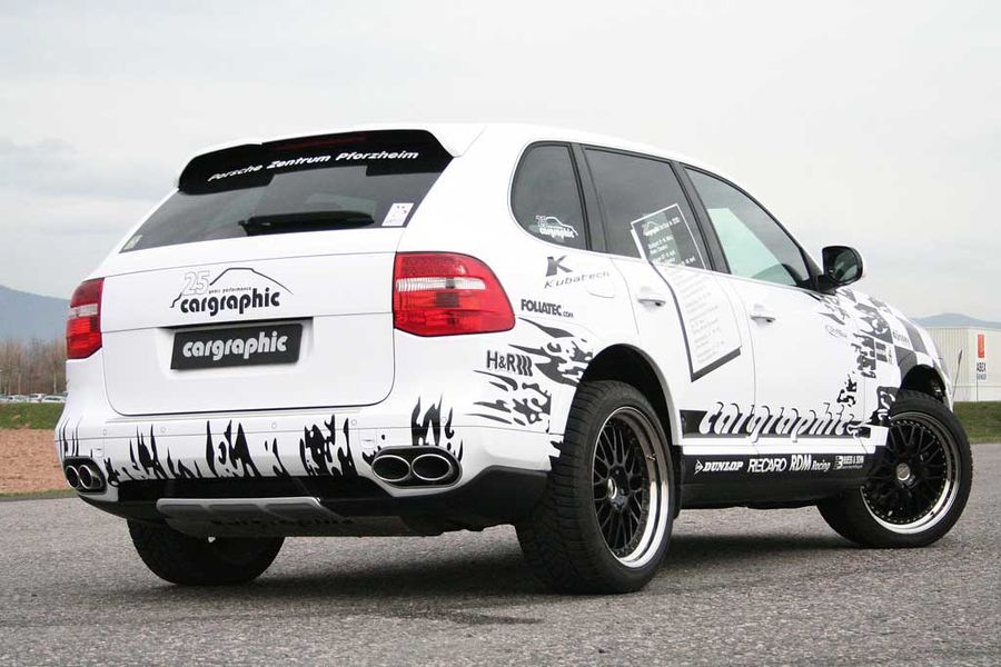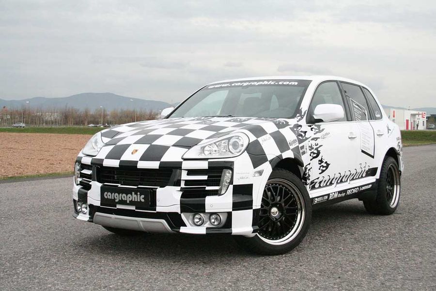 Однако больше всего в глаза бросаются наклейки, идущие по всему кузову Porsche, которые были придуманы и выполнены в тесном сотрудничестве с фирмой FOLIATEC.com и наклеены специалистами folioCar. Как и в классическом нью-йоркском такси «Checker Cabs» новый Cayenne разукрашен в черно-белую шашечку, при этом рисунок расплывается подобно флагу в области колесных ниш, подчеркивая тем самым всю мощь ускорения спортивного лимузина. Этим детищем ювелиры от тюнинга из немецкого Ландау хотят подчеркнуть свой вклад в гоночный спорт. Ноу-хау фирмы Cargraphic отражается не только в сугубо спортивных гоночных автомобилях, но и в уличных суперкарах. Специалисты фирмы уделяют внимание не только внешнему дизайну автомобилей, но и ходовым качествам, аэродинамике. В мастерских Cargraphic с давних пор тюнингуются не только Porsche, но и другие, не менее знаменитые марки. Предприятиям, занимающимся извозом на такси, не следует особенно волноваться – данное произведение искусства не составит им конкуренции, ведь оно будет путешествовать по Германии, выставляясь на самых знаменитых автосалонах.