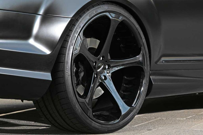 Легкосплавные 22-дюймовые диски выбраны черного цвета, с ободом из черного карбона. Передние диски 9x22 дюйма с покрышками Michelin размером 275/25-22, задние - 10,5x22 с покрышками размером 295/25-22. Сквозь диски проглядывают покрытые черным лаком тормозные суппорта. Сзади, на багажнике, установлена губа спойлера, а электронная регулируемая подвеска позволяет добиться высоких спортивных показателей.