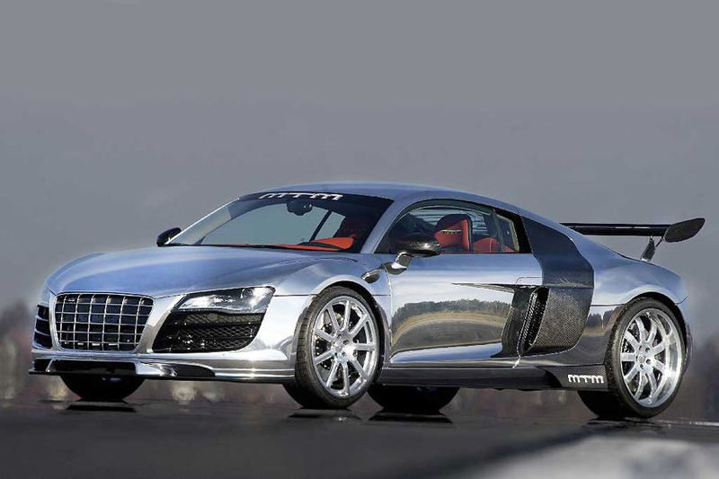 Больно смотреть на AUDI R8 без темных очков. Около 700 рабочих часов понадобилось для того, чтобы довести кузов спорткара до зеркального глянца. Пластиковые накладки частично были заменены карбоновыми, а оставшиеся выкрашены блестящим лаком в цвет кузова. Для того, чтобы машина устанавливала рекорды на земле, а не в воздухе, боковые пороги были расширены, установлен передний спойлер и регулируемый задний спойлер – всё из карбона. Интерьер салона тоже был усовершенствован, ведь мастера из МТМ привыкли прорабатывать тюнинг до мельчайших деталей