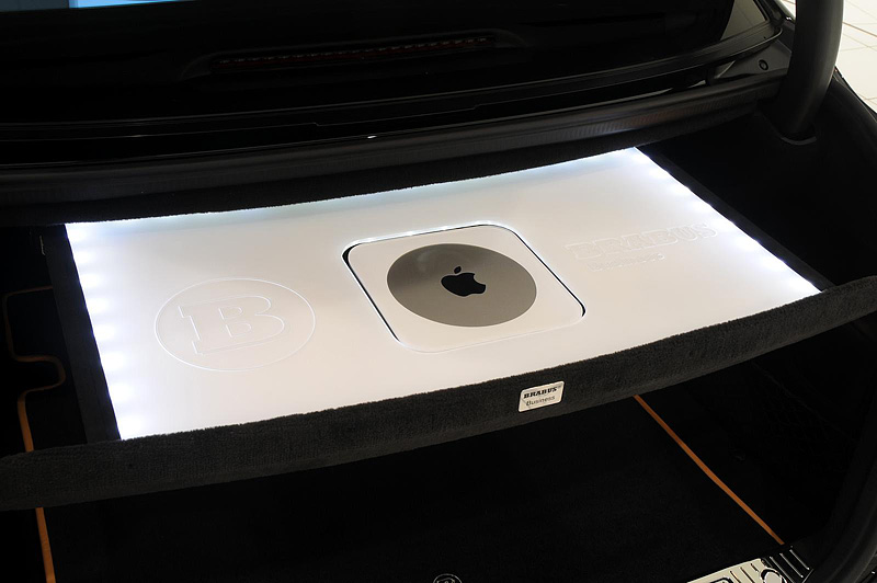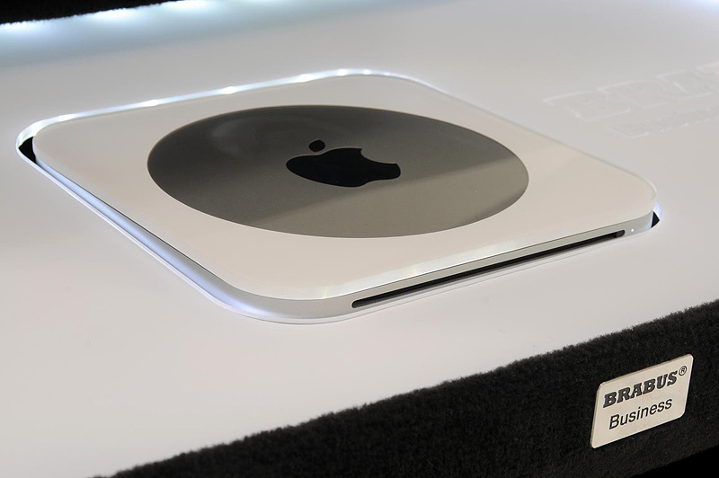 Мультимедийная система управляется с пассажирского, или с любого из двух задних сидений, через компьютеры Apple можно управлять и такими функциями седана, как телефон, навигационная система или радио-CD-плейер. Во время езды два задних компьютера надежно закрепляются на откидных планшетах, вмонтированных в спинки передних сидений. Столешницы откидных планшетов покрыты той же кожей, что и весь салон, а в качестве фиксирующего компьютер элемента выбраны блестящие алюминиевые рамки. Столешницы открываются автоматически, на электроприводе, и их можно развернуть под любым удобным для работы углом. Когда работа закончена, или машина остановилась на парковке, компьютеры можно спрятать от любопытных глаз и шаловливых рук в среднюю консоль, а откидные планшеты закрыть. Специальный компьютерный софт Brabus для iPad и iPhone, последний из которых, кстати, является частью стандартного оборудования автомобиля, будут доступны в ближайшее время.