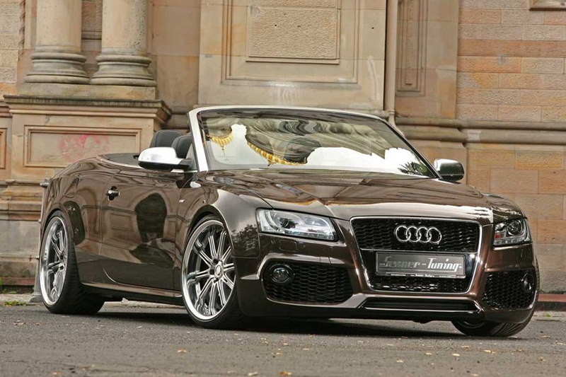 Немецкое ателье Senner Tuning AG предлагает всем владельцам кабриолетов Audi A5 и S5 разнообразные тюнинг-программы. Например, для А5 с двухлитровым TFSI-мотором существует возможность установки спортивных воздушных фильтров и оптимизации ПО блока управления двигателем – в результате мощность на выходе будет составлять максимум 275 л.с. а максимальный крутящий момент 430 Нм. В добавок можно установить так называемый Power Converter – преобразователь мощности, позволяющий ускорить реакцию мотора при нажатии на педаль газа – засчет этого машина будет разгоняться еще резвее. Тюнеры Senner предлагают новую выхлопную трубу, звук которой гарантирует, что у всех вокруг пойдут мурашки по коже. Четырехпатрубковый стальной спортивный глушитель сделан в мастерской Senner, диаметр каждого патрубка составляет 88 мм.