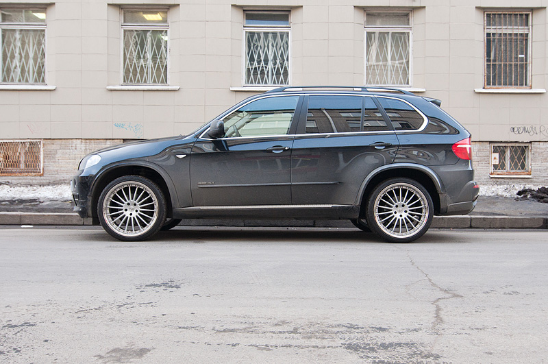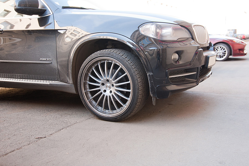 На BMW X5 на лето были установлены новые диски HAMANN ANNIVERSARY EVO. Размерностью 10,5x22" спереди и 12,0x22" сзади. Довольно редкий размер в нашем городе. Но, согласитесь, на таких дисках машина выглядит совсем по-другому. На порядок лучше!