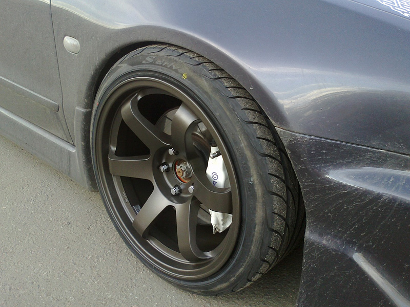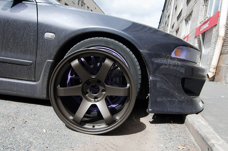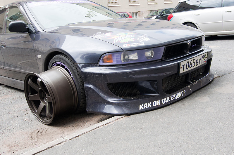 Нашему хорошему другу - дизайнеру Антону Dnaike, знаменитому в автомобильных кругах по сумасшедшим винилам, на его Mitsubishi Galant VR4 были установлены диски Rota Grid 18x9.5" ET20, правильные по всем канонам философии Stance.