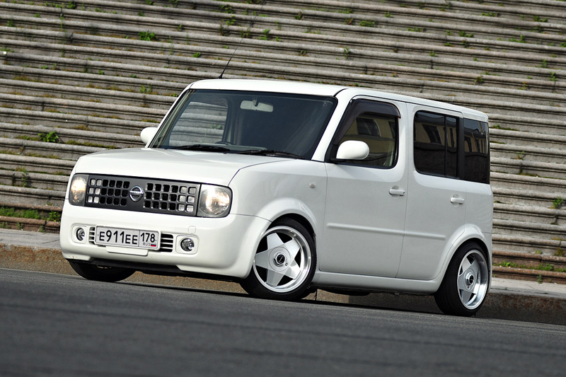 На автомобиль Nissan Cube z11 были установлены диски Borbet Design A 7.5x16" ET20 c резиной 165/50 R16 Nankang AS-1. Классические немецкие широкие диски в комплекте с узкой резиной отлично вписались в необычный дизайн японского автомобиля. А за счет установки заниженной подвески автомобиль стал выглядеть еще более гармонично и притягивать еще больше взглядов.