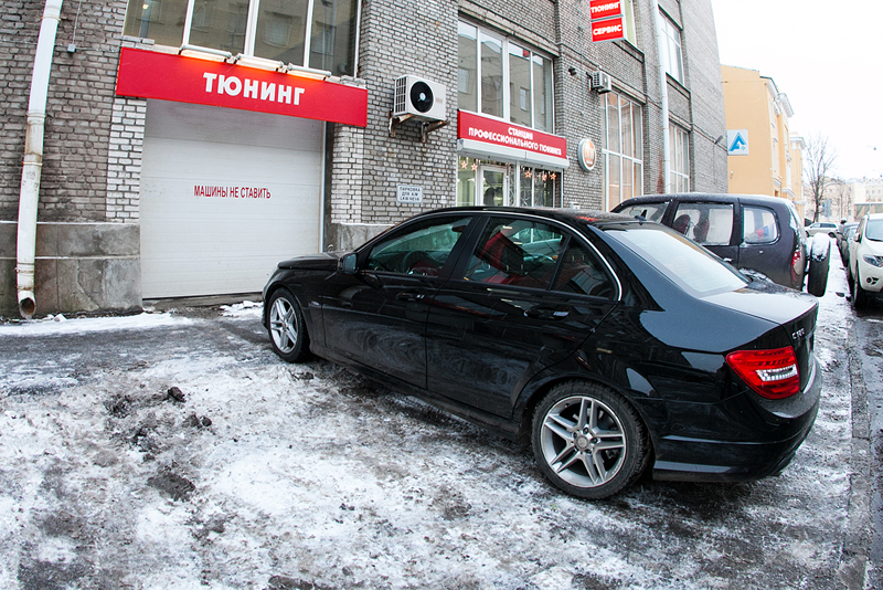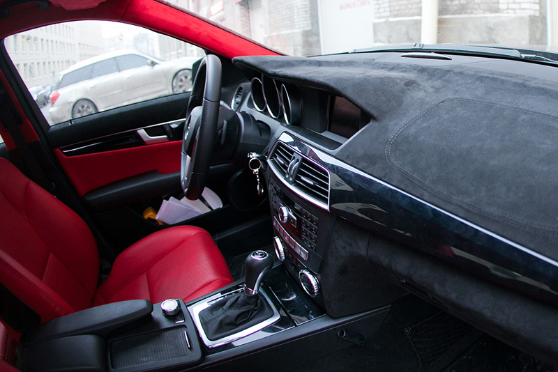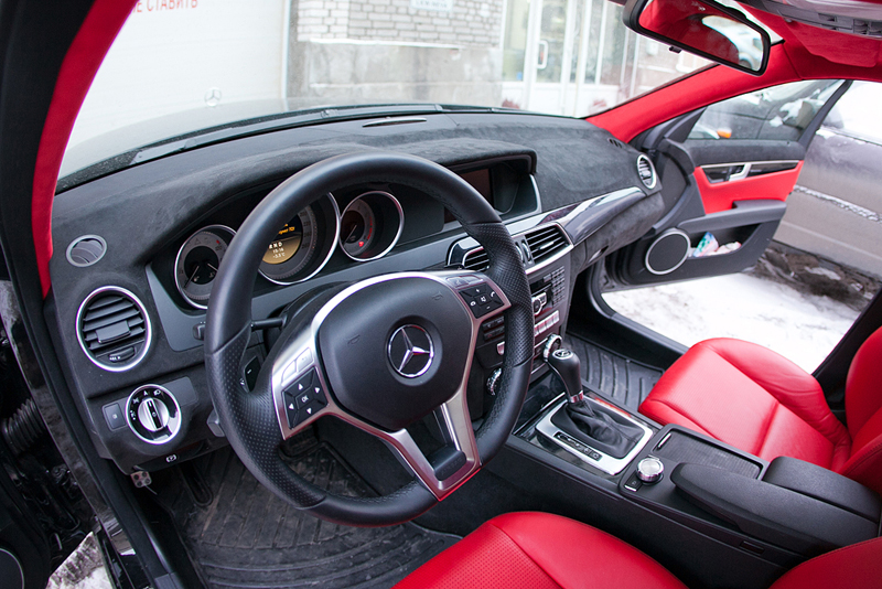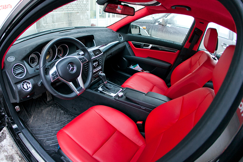 На новом рестайлинговом C-class'е был полностью перешит салон в кожу и алькантару красного и черного цветов. Изначально черный салон с пластмассовой торпедой было решено перешить в кожу ярко-красного цвета. Чтобы смотреть каждый день на этот салон и радоваться, долгой зимой, дождливым летом, невеселыми осенью и весной. Сиденья и потолок сделаны из красной кожи Hans Reinke и алькантары. Торпеда была перетянута в алькантару черного цвета. Также черная алькантара, как продолжение торпеды заходит на дверные обшивки, где отлично гармонирует с вставками из той-же красной кожи.