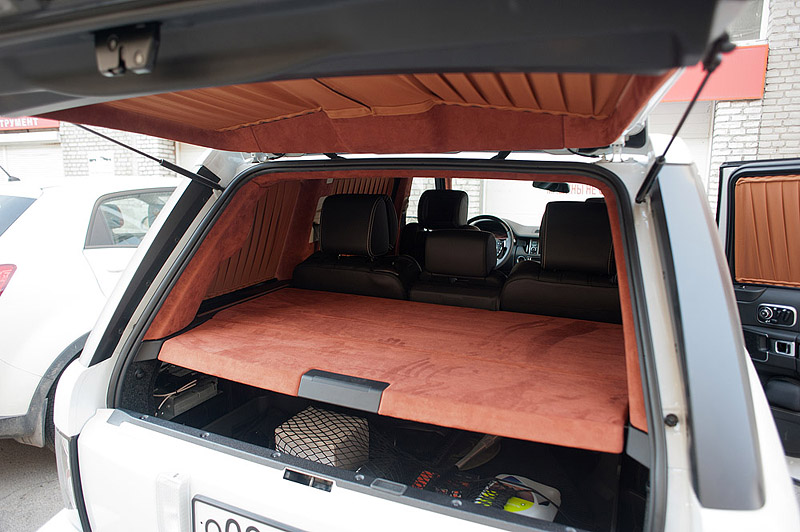 На автомобиле Range Rover westminster были проведены работы по перешиву потолка, козырьков и задней полки в алькантару, также были установлены шторы на передние и задние окна автомобиля. Шторы двуслойные - внутри, в тон интерьера - коричневые, снаружи - черные.