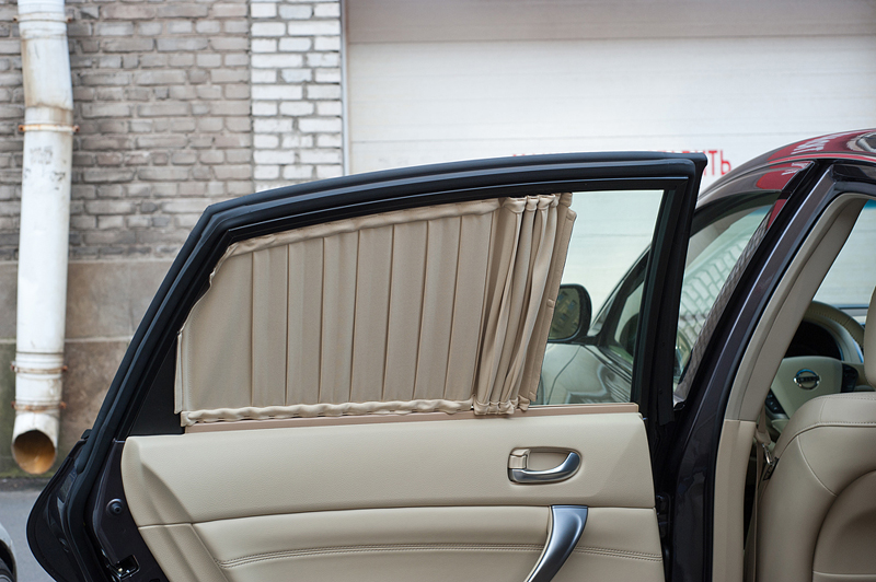 На новую Nissan Teana были установлены шторки на задние двери и заднее стекло. Шторки двухцветные - снаружи черные, изнутри бежевые, под цвет салона. Они крепятся на двух направляющих, что позволяет сдвигать из в случае необходимости.