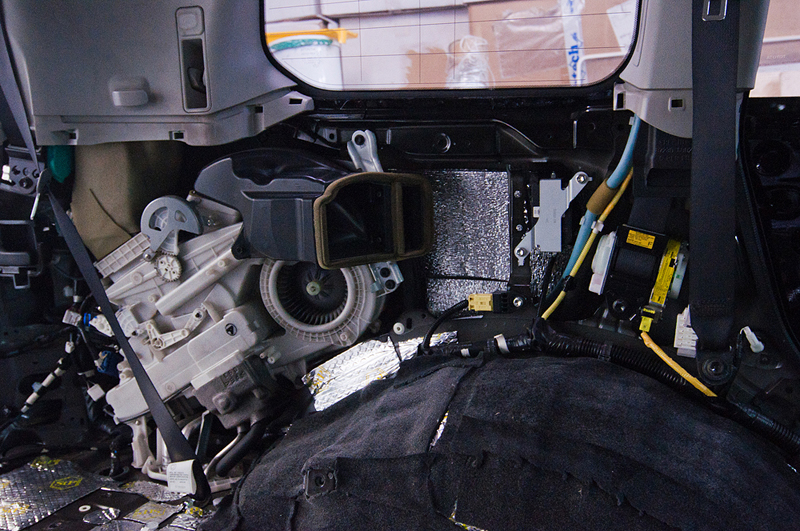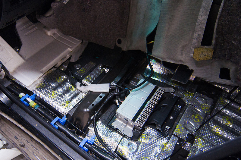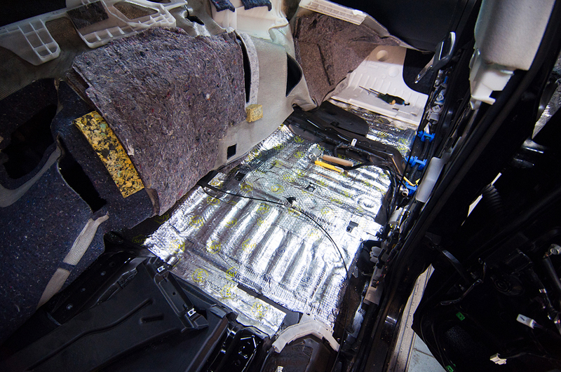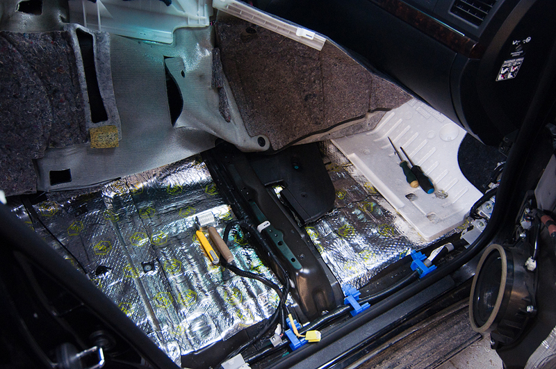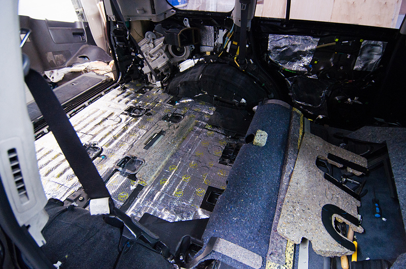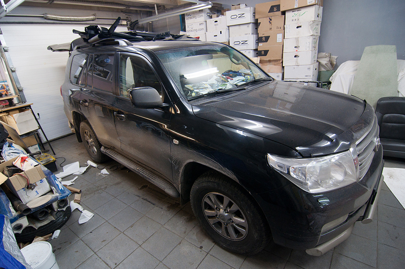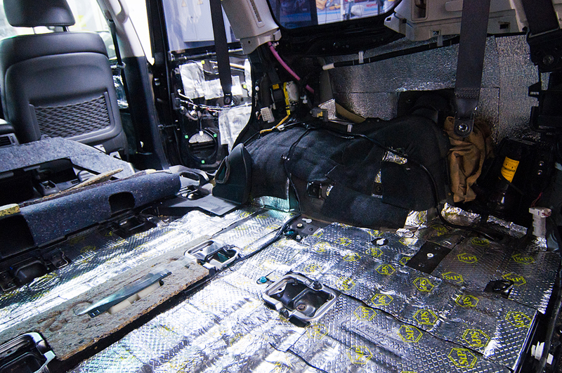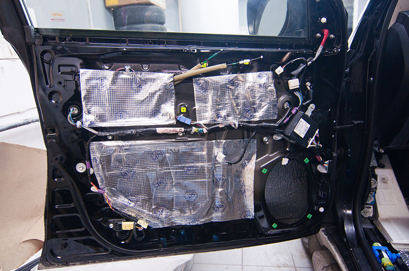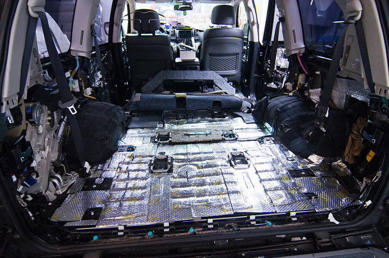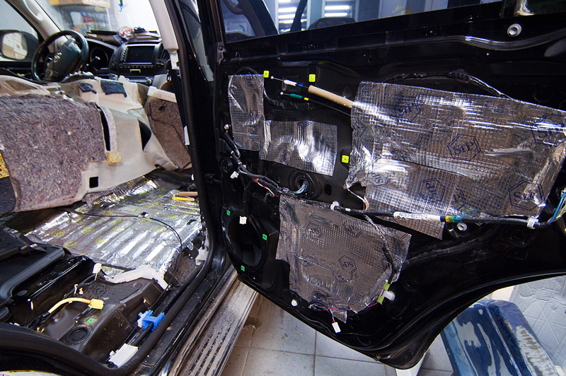 Был проведен комплекс работ по шумоизоляции и виброизоляции салона автомобиля Toyota Land Cruiser 200. Все двери и пол были были покрыты специальными материалами которые понижают уровень шума издаваемого автомобилем, его механическими частями (двигатель, КПП, подвеска), а также выбросом камней и гравия на арки колес. Сначала пол и двери автомобиля проклеиваются вибродемпфирующим материалом. Поверх вибродемпфирующего материала наносится Сплен - он поглощает шум высокой частоты.