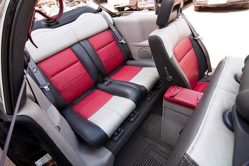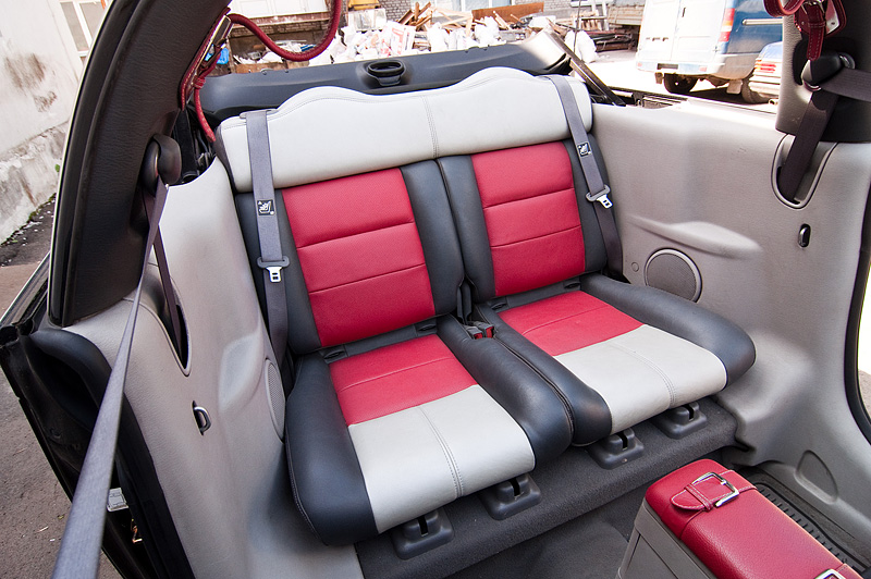 В салоне тоже много уже не так как было. Так как Фидель - кабриолет, то его салон обязан быть ярким - в интерьере доминирует красный цвет. Перешиты все сиденья, часть торпеды, вставки в двери, руль, особого внимания заслуживают ремешки, которые особенно нравятся хозяину автомобиля.