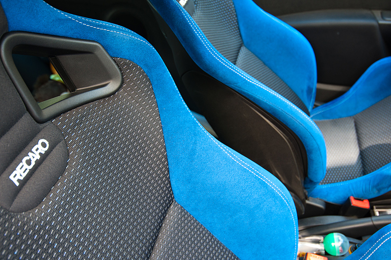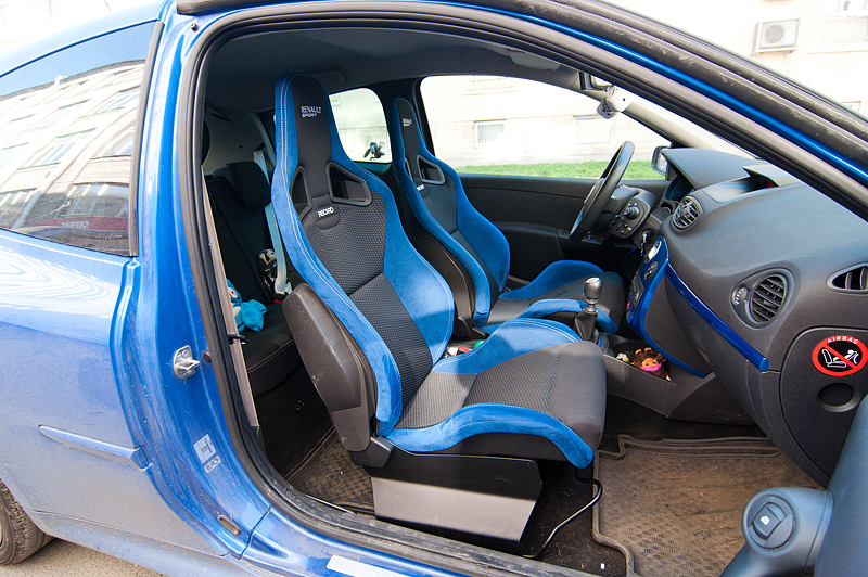 На Renault Clio RS были перешиты боковины ковшей в цвет машины. Покрашены в синий части торпедо и передних дверей.