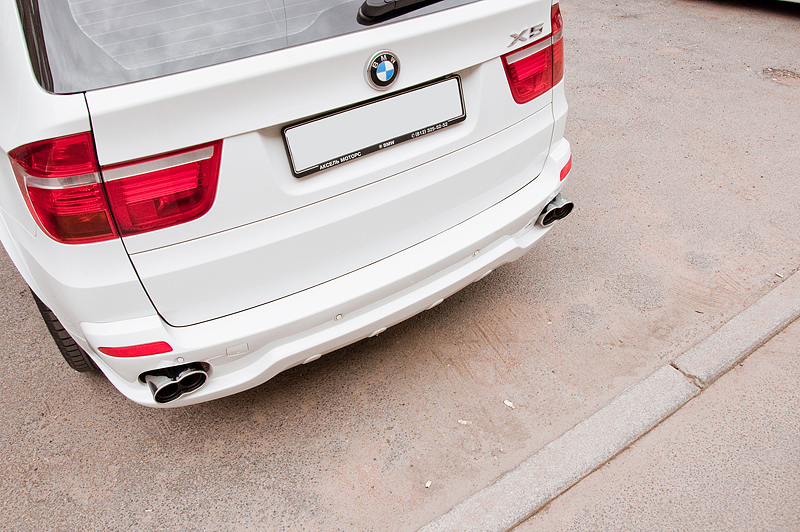 Такой аэрокит для X5 понравится всем – стильный, но отнюдь не переворачивающий наши представления о модели. Новая передняя юбка с объемным воздухозаборником и законцовками-спойлерами существенно приблизила к асфальту переднюю часть машины и заметно добавляющие узнаваемости и индивидуальности всему комплекту. Доволнительно в неё была установлена очень популярная сейчас LED-подсветка. В заднюю юбку интегрированы две сдвоенные насадки выхлопной системы из нержавеющей стали. Также в комплект входят новые пороги, стандартно они черного цвета, но в этот раз мы их покрасили в белый - так общий вид автомобиля стал намного гармоничнее.