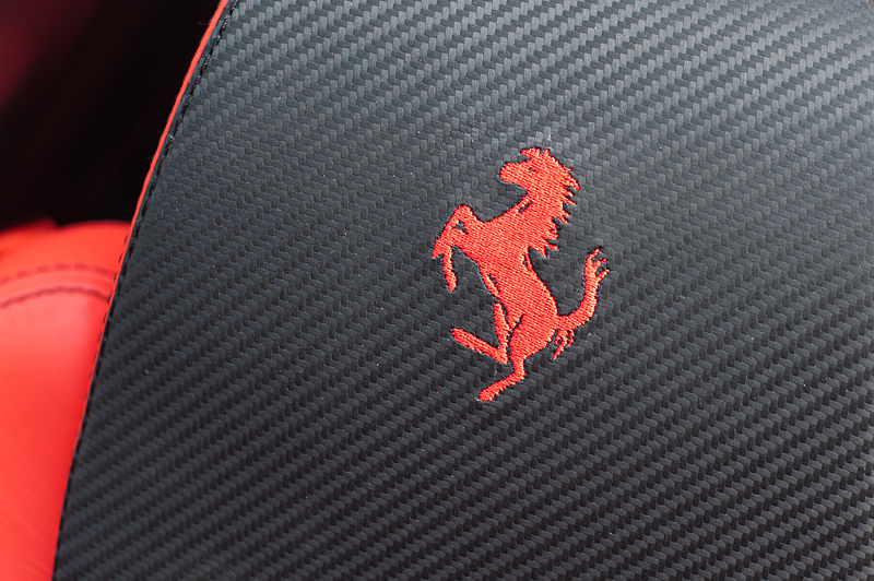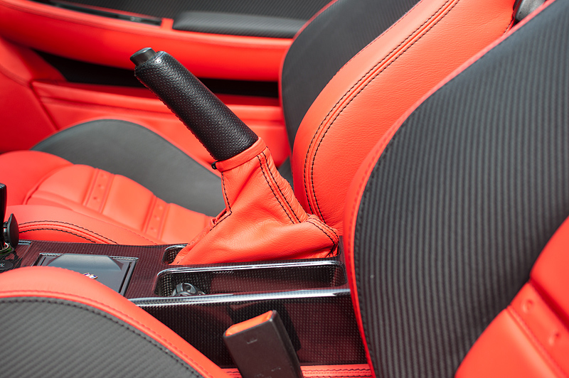 По заранее продуманному и утвержденному эскизу был полностью перешит салон в красную и карбоновую кожу: