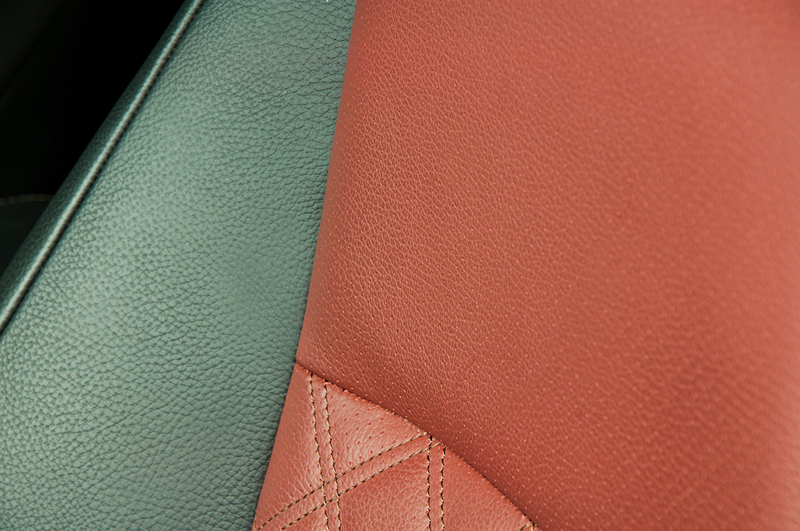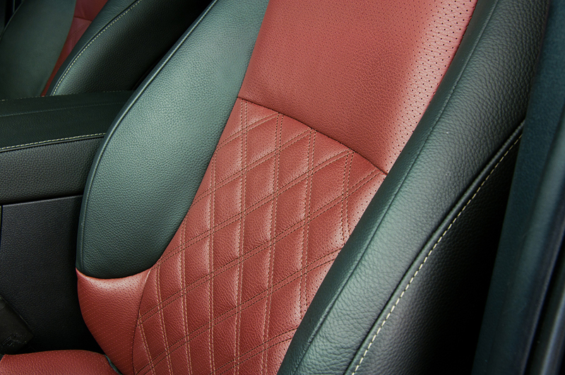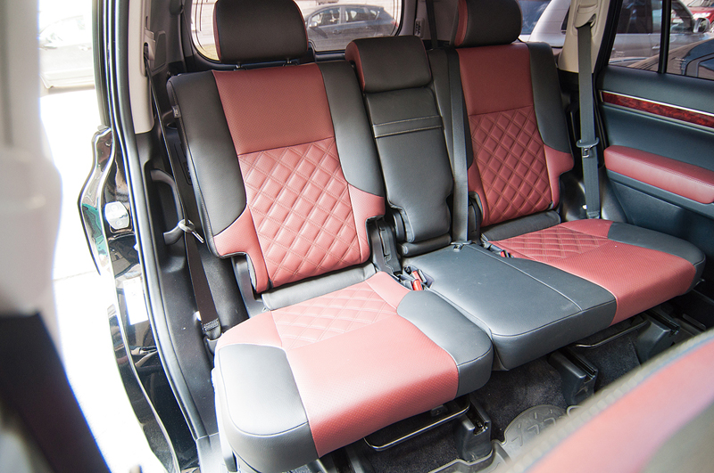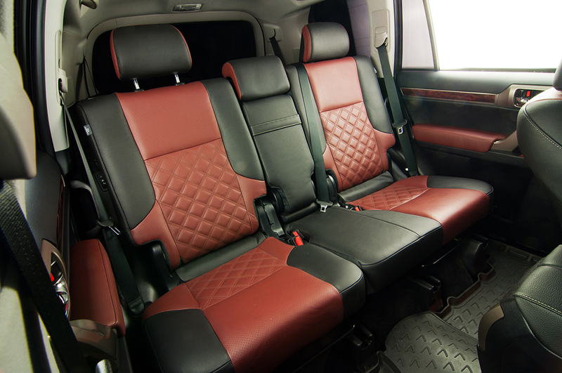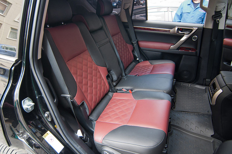 На небольшом джипе Lexus GX460 стандартный скучный черный салон был перешит в два цвета: черный с тёмно красным. На центральных вставках в сиденьях были вышиты ромбики, что добавило изысканности салону автомобиля. На вставках в дверях тоже появился красный цвет.