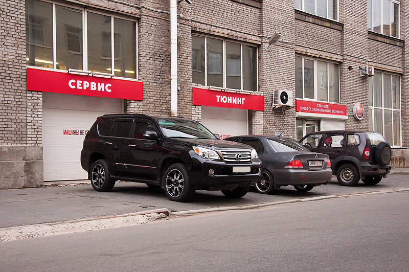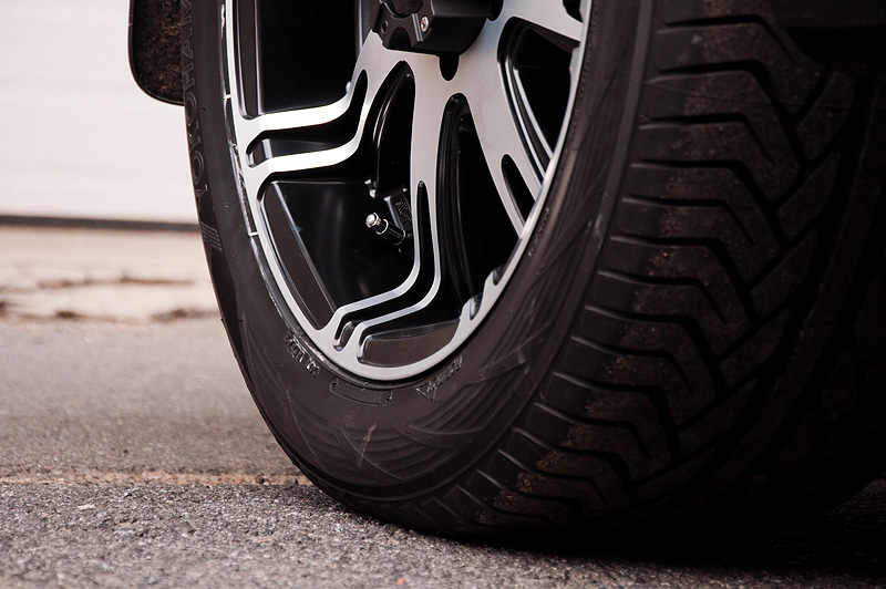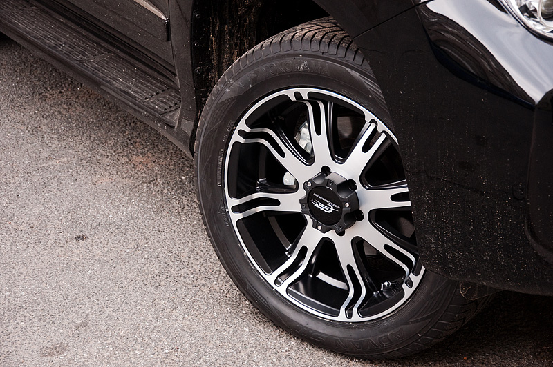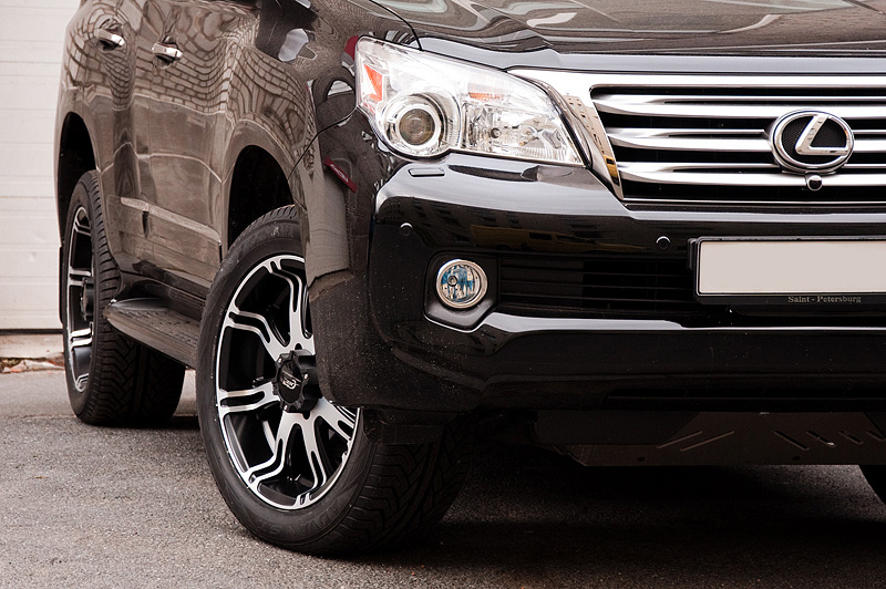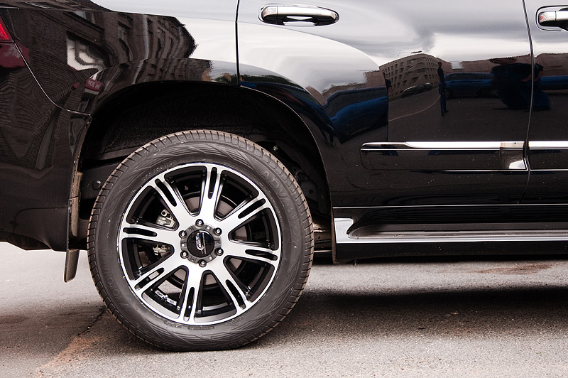 На новенький Lexus GX460 были установлены необычные колесные диски фирмы American Racing модель DEJ 708 черного цвета, диаметр - 20", ширина - 9". С одной стороны у них есть небольшая полка, а с другой, что является большой редкостью, общий рисунок спиц диска заходит на полку. Чтобы понять проще посмотреть на фотографии, представленные ниже. Спицы плавно находящие на полку ничуть не скрадывают её, а наоборот подчеркивают. Это хорошо помогает оптически отделить её.