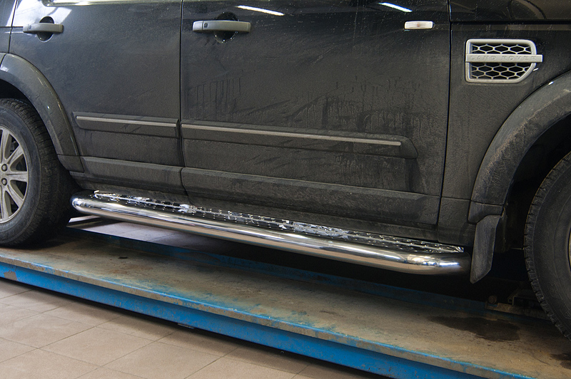На новый Land Rover Discovery 4 были установлены пороги немецкой фирмы Schiessler. Благодаря им садится и выходить из высокого автомобиля стало намного легче и удобнее. Пороги изготовлены из прочной стали благодаря чему обеспечивают надежную защиту автомобиля. Продуманная система креплений разработана специально для Disco 4. Немецкое качество для Вашего удобства.
