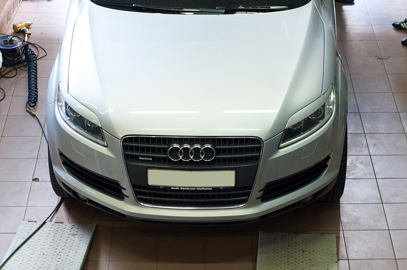 Audi Q7 - покрашены и установлены накладки на фары Je Design, установлены проставки на переднюю и заднюю оси. Благодаря эти незначительным изменениям машина стала выглядеть намного лучше и аккуратнее.