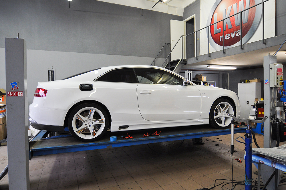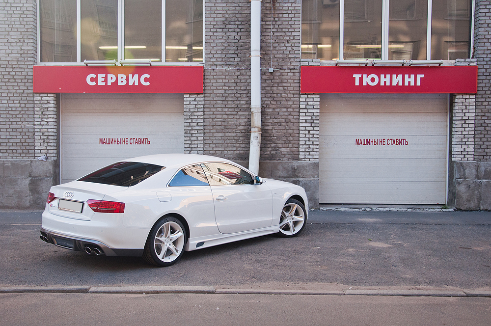 На новенькую Аudi S5 был установлен аэродинамический обвес Rieger и белые диски Etabeta Jofiel X-Ceramic 19x8.5".