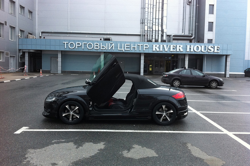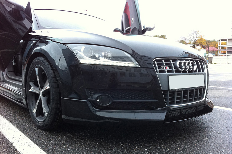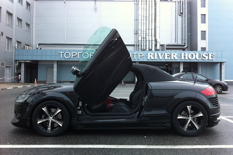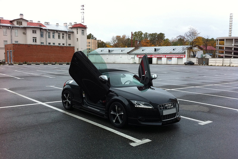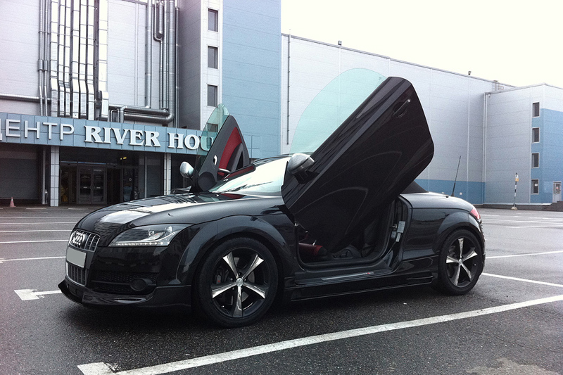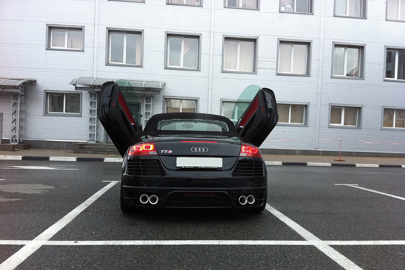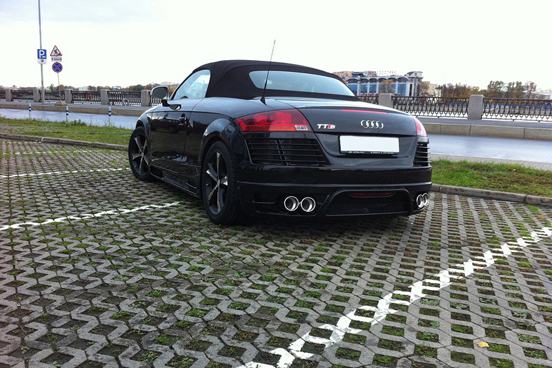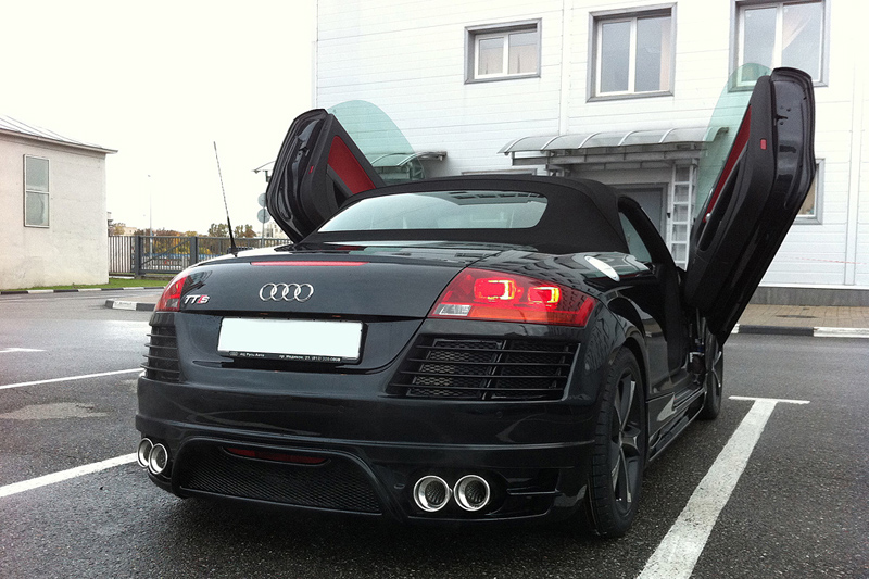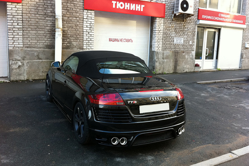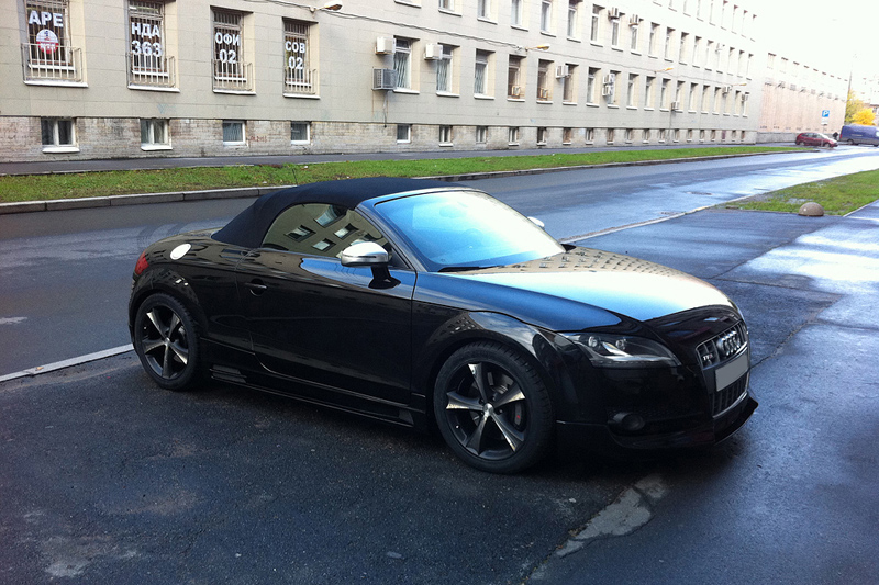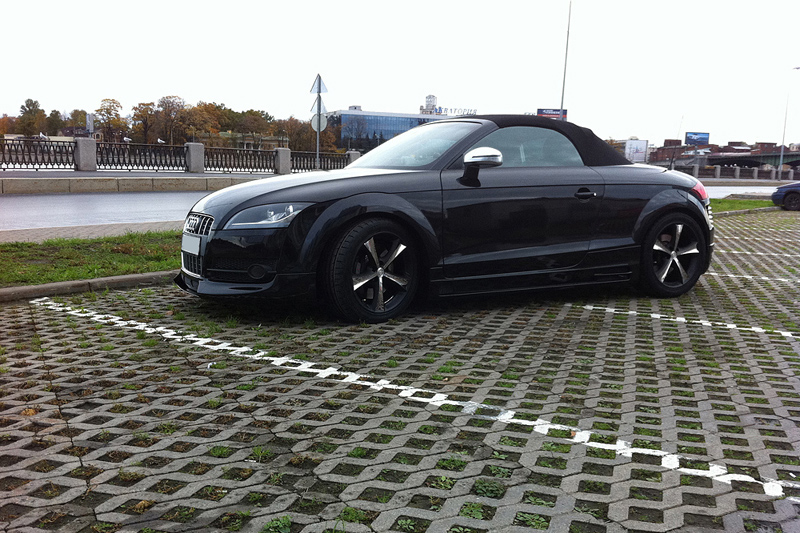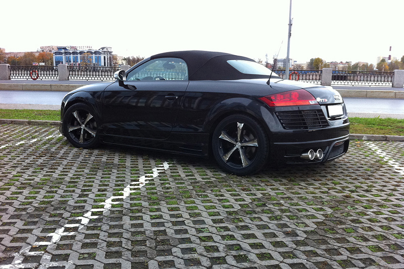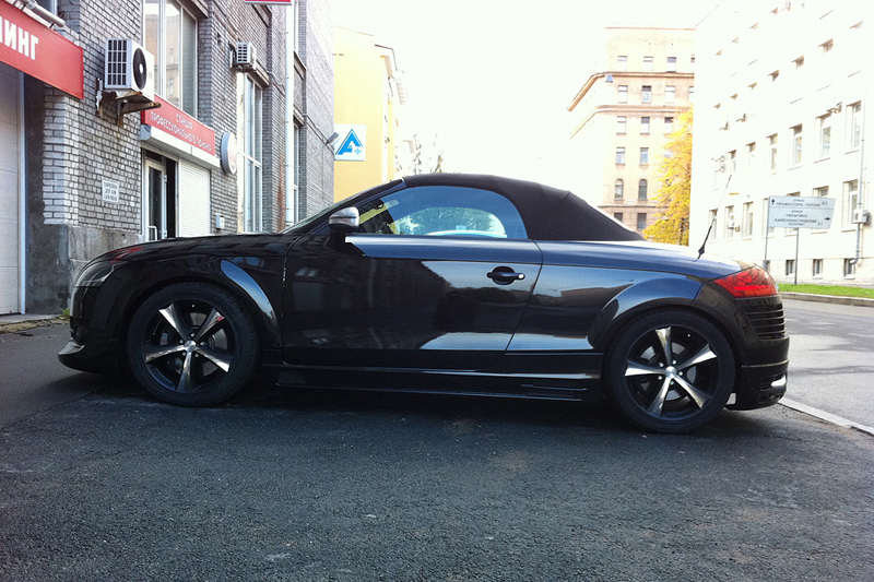 На кабриолет Audi TTs был установлен обвес фирмы Rieger, диски Eta beta 18 дюймов и Lambo Style двери. Обвес состоит из заднего бампера, спойлера, боковых порогов, накладки на передний бампер. Т.к. передние бампера у Audi TT и Audi TTs разные, а обвес Rieger подходит для Audi TT, то пришлось на автомобиль сначала поставить бампер от ТТ, а потом уже на него ставилась передняя юбка от Rieger. Диски Eta Beta Jofiel 18x8.5" c резиной Michelin. И Ламбо двери, на кабриолете они выглядят намного лучше, чем на седанах и купе.
